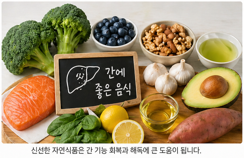 아래 식단은 실제로 간 건강에 도움이 되는 구성입니다.