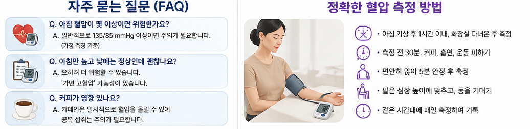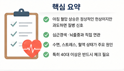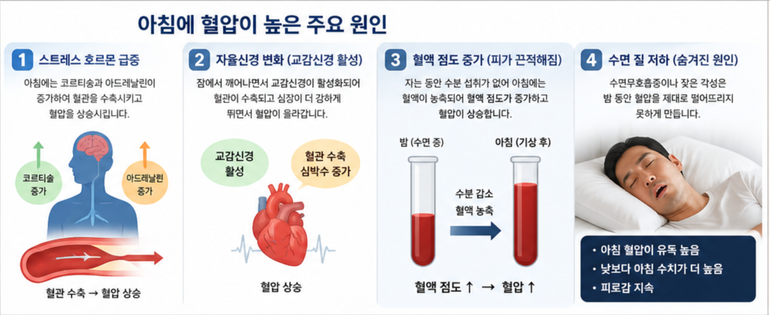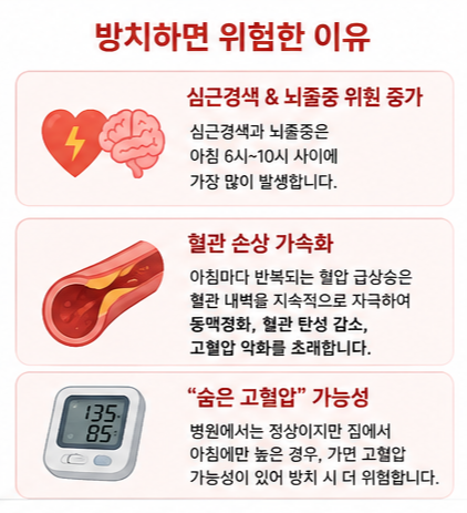 아침에 일어나자마자 머리가 띵하거나, 심장이 두근거리는 느낌을 받은 적 있나요? 특히 건강검진에서 “아침 혈압이 높다”는 이야기를 듣고도 대수롭지 않게 넘기는 경우가 많습니다.