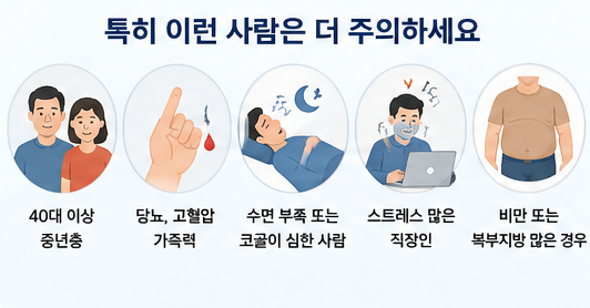 👉 특히 40대 이후, 스트레스가 많거나 수면이 부족한 경우 더 크게 상승합니다.