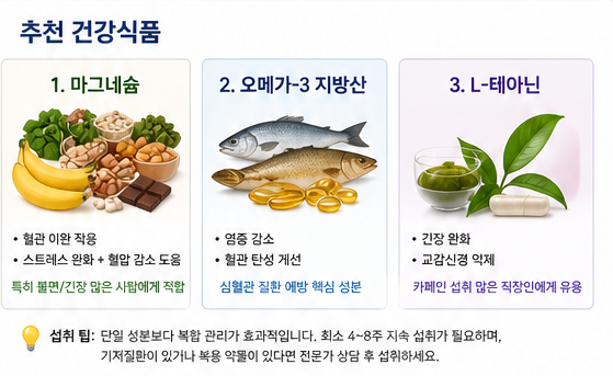 섭취 팁: 단일 성분에만 의존하기보다 수면, 운동, 식단과 함께 관리하는 것이 좋습니다. 기저질환이 있거나 혈압약을 복용 중이라면 반드시 전문가 상담 후 섭취해야 합니다.