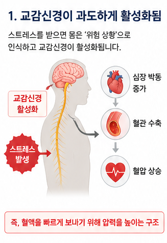 - 스트레스 → 교감신경 활성 → 혈압 상승
