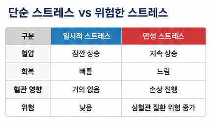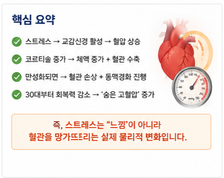 👉 즉, 스트레스는 “느낌”이 아니라 혈관을 망가뜨리는 실제 물리적 변화입니다.