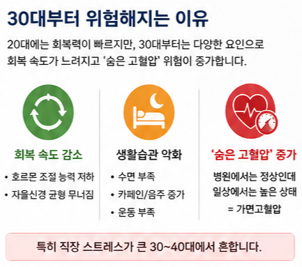 - 30대부터 회복력 감소 → ‘숨은 고혈압’ 증가