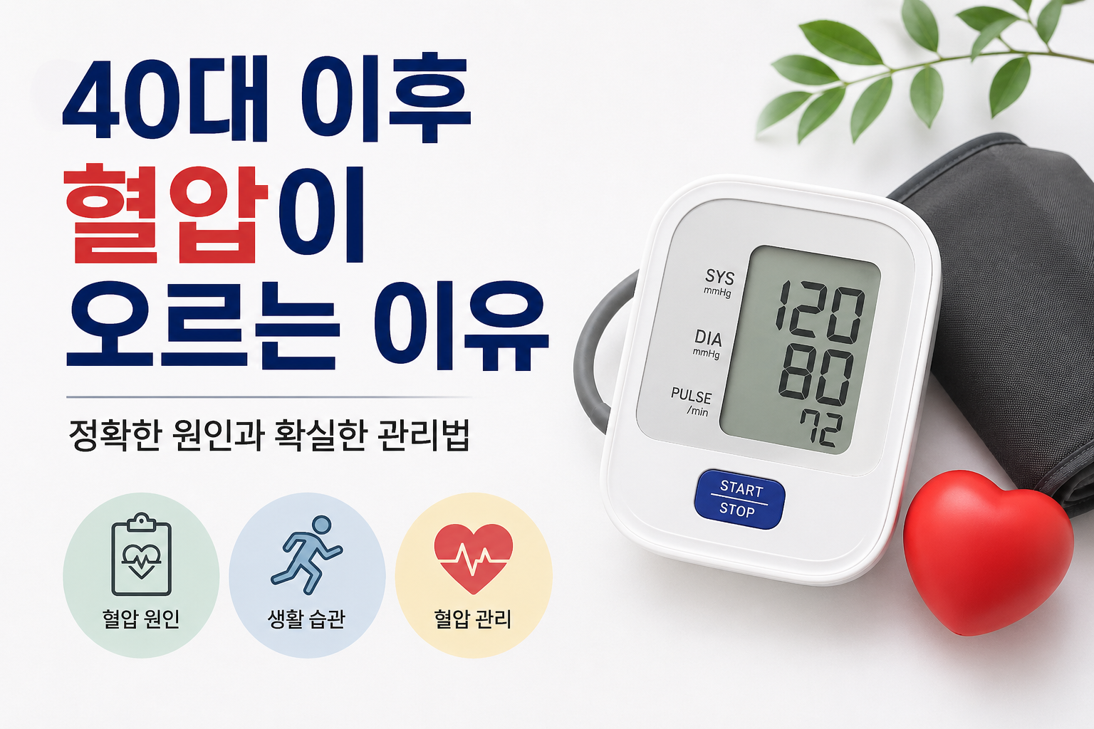 40대 이후 혈압이 갑자기 오르는 이유|정확한 원인과 확실한 관리법40대가 되면 건강검진에서 처음으로 혈압이 높다는 말을 듣는 분들이 많습니다.하지만 40대 이후 혈압 상승은 단순한 노화만으로 설명하기 어렵습니다. 혈관 탄성 저하, 복부비만, 나트륨 과다 섭취, 운동 부족, 수면 문제, 스트레스, 음주, 가족력 등이 함께 작용합니다.핵심 요약 혈관이 예전보다 딱딱해지면 혈압이 오르기 쉽습니다. 복부비만은 혈압, 혈당, 중성지방을 함께 악화시킬 수 있습니다. 짠 음식과 국물 섭취는 혈압 관리에서 가장 먼저 줄여야 할 요소입니다. 운동 부족, 수면 부족, 스트레스, 음주도 혈압 상승과 관련됩니다. 혈압은 증상이 없어도 혈관과 장기에 부담을 줄 수 있습니다.목차 혈압은 왜 중요할까? 40대 이후 ..