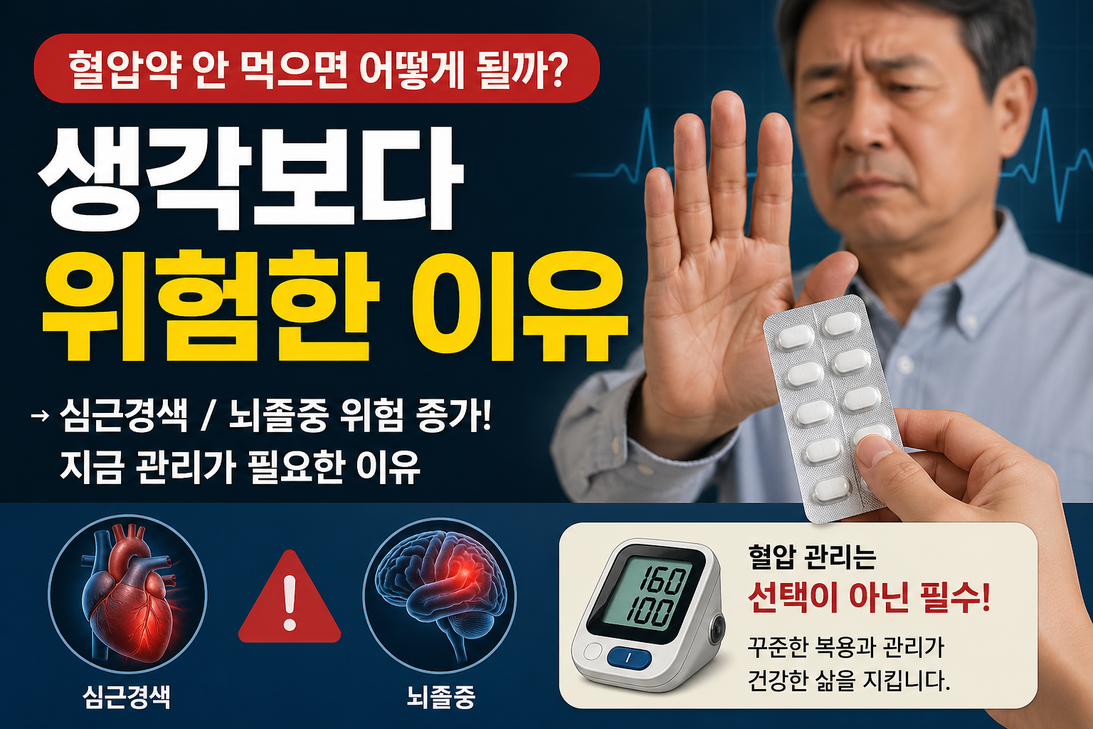 혈압약 안 먹으면 어떻게 될까? 생각보다 위험한 이유어느 날 병원에서 “혈압이 높습니다”라는 말을 듣고 약을 처방받았지만,며칠 먹다가 스스로 끊어버린 경험 있으신가요?“이 정도면 괜찮겠지”“약 없이도 조절해보자”이렇게 생각하는 분들이 많습니다.하지만 혈압약을 임의로 중단하는 행동은 생각보다 훨씬 위험할 수 있습니다.혈압약을 안 먹으면 몸에서 일어나는 변화고혈압은 단순히 숫자가 높은 문제가 아니라혈관 자체가 계속 손상되는 진행성 질환입니다.약을 중단하면 다음과 같은 변화가 생깁니다.1) 혈관이 다시 수축하기 시작합니다혈압약은 혈관을 넓혀주는 역할을 합니다.하지만 약을 끊으면 혈관은 다시 좁아지며→ 혈압 상승→ 혈류 저항 증가→ 심장 부담 증가이 과정이 빠르게 진행됩니다.2) 자율신경 균형이 무너집니다혈압은..