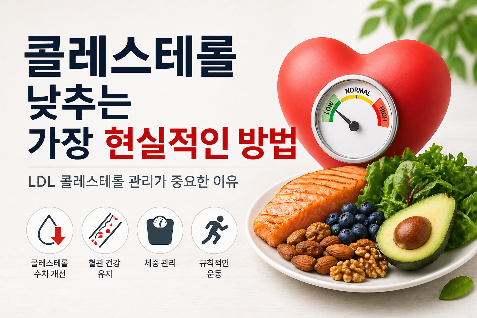 콜레스테롤 수치 낮추는 가장 현실적인 방법|40대 이후 LDL 관리법콜레스테롤 수치가 높다는 말을 들으면 단순히 기름진 음식을 많이 먹어서라고 생각하기 쉽습니다.하지만 40대 이후 콜레스테롤 상승은 복부비만, 운동 부족, 수면 부족, 음주, 유전, 인슐린 저항성 등이 함께 작용한 결과일 수 있습니다. 목차콜레스테롤은 무조건 나쁜 걸까?40대 이후 콜레스테롤이 높아지는 이유콜레스테롤 낮추는 식습관운동으로 콜레스테롤 관리하는 법추천 건강식품 멘트병원 검사가 필요한 경우1. 콜레스테롤은 무조건 나쁜 걸까?콜레스테롤은 세포막, 호르몬, 담즙산 생성에 필요한 성분입니다. 문제는 혈관 벽에 쌓이기 쉬운 LDL 콜레스테롤이 높을 때입니다.LDL 콜레스테롤: 혈관 벽에 쌓여 동맥경화 위험을 높일 수 있음HDL 콜레스테..