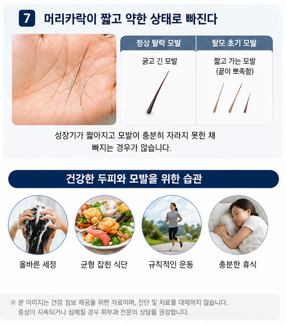 7. 머리카락이 짧고 약한 상태로 빠진다