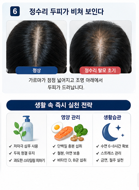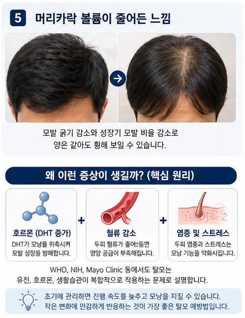 머리숱은 그대로인데 “휑해 보인다”는 느낌이 든다면 이미 진행 중일 가능성이 큽니다.