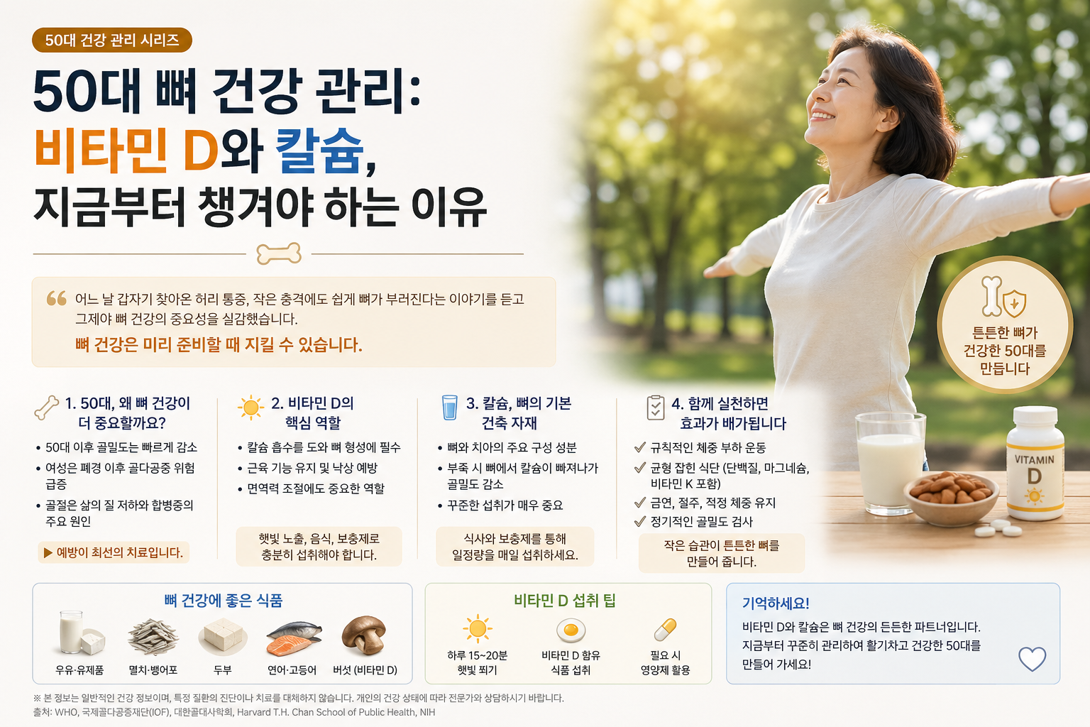 50대의 뼈 건강 관리는 단순히 영양제를 먹는 문제가 아닙니다. 햇볕, 식사, 운동, 검진이 함께 가야 합니다. 오늘부터 하루 10분 산책과 칼슘이 풍부한 식단으로 뼈 건강을 지켜보세요.